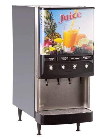 Cold beverage concentrate dispenser with four dispense heads, a High Intensity® Mixing System for premium drink consistency (brix accuracy), and superior burst capacity to provide more cold, quality beverages --- all in an easy to use, operator friendly design.